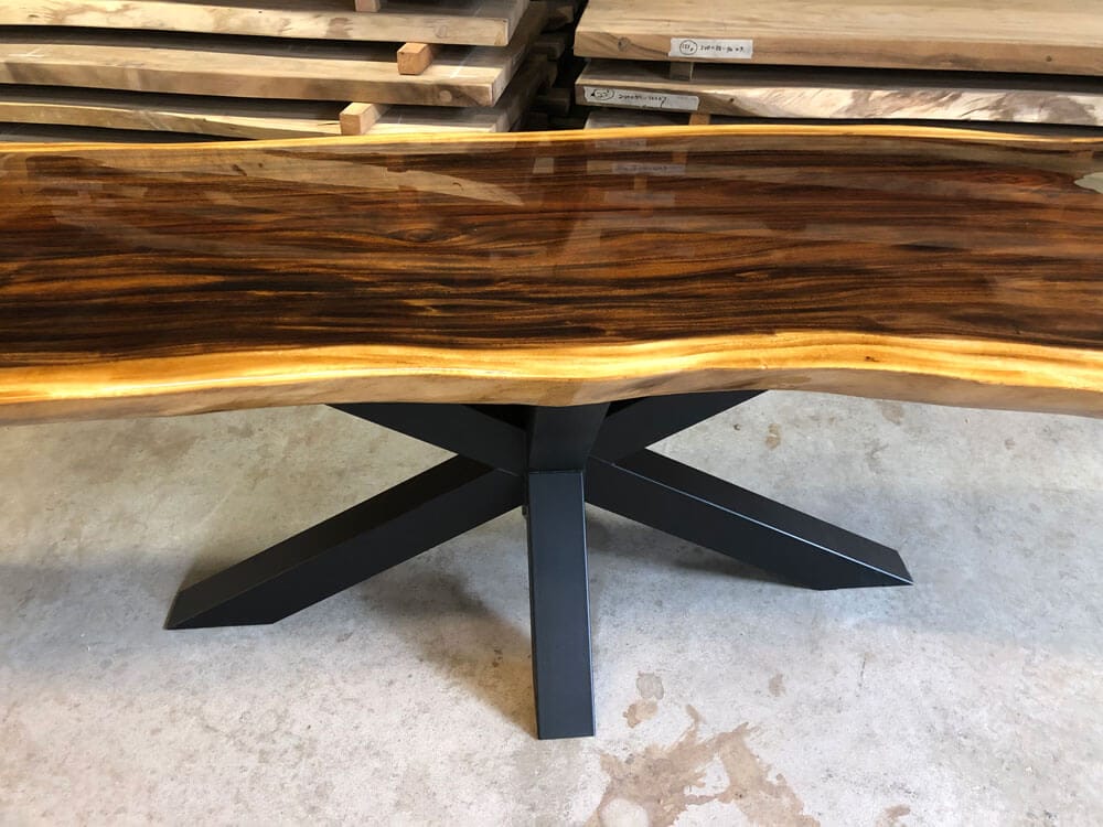 Het X-onderstel valt op door zijn kruising en krachtige vorm. Perfect voor wie zoekt naar een stevige basis met een industrieel accent.