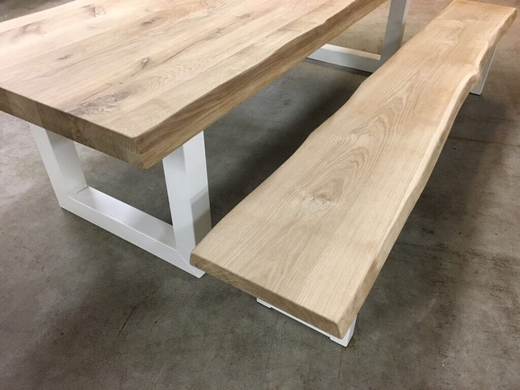 De originele rand van de boom blijft behouden. Elk eiken boomstam tafelblad is uniek en vol karakter.