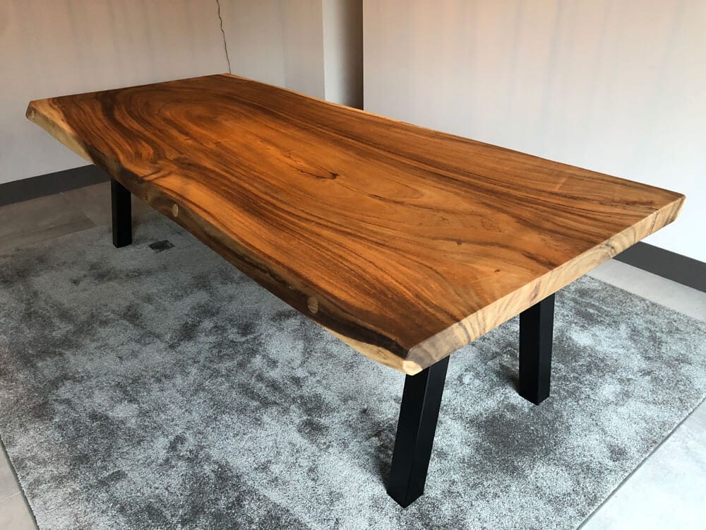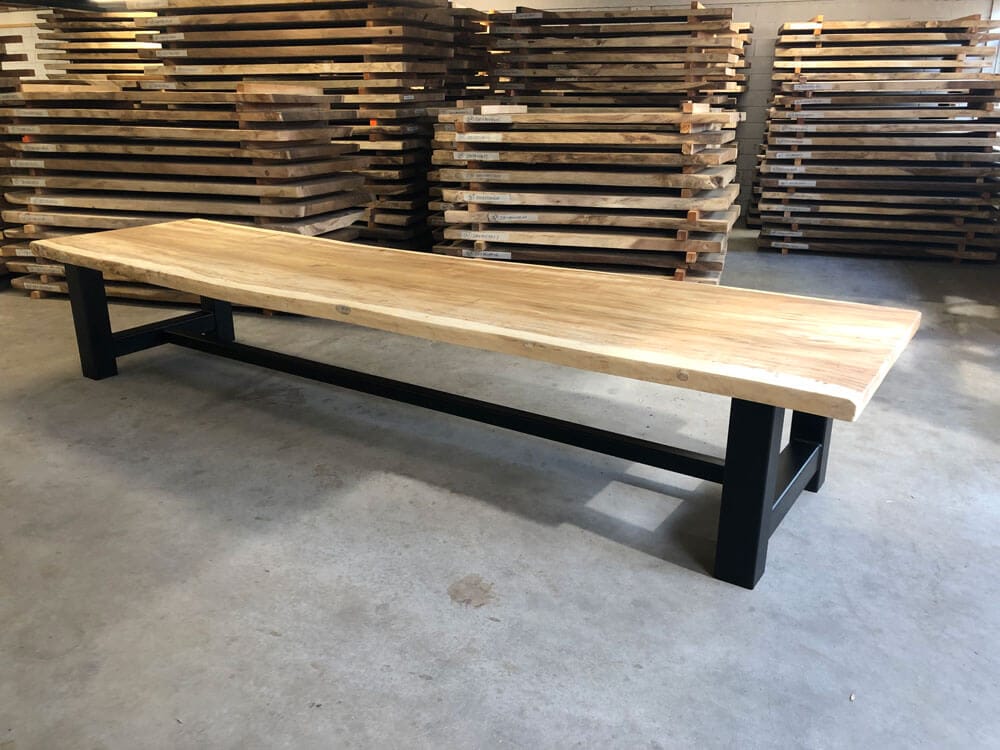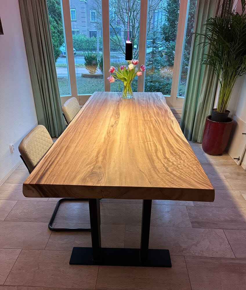 Eettafels uit één stuk, bij Suar, zijn uniek in hun soort. Ze behouden de volledige breedte en tekening van de boom, zonder naden of verlijmingen. Dit maakt ze extreem sterk en visueel krachtig. Wie van natuurlijk houdt, kiest voor een eettafel met boomkant. Hierbij blijft de grillige, organische rand van het hout behouden. Het resultaat is een tafelblad met karakter dat elk interieur direct meer warmte en authenticiteit geeft. Deze bladen zijn beschikbaar in diverse lengtes, breedtes en diktes, met of zonder afwerking.